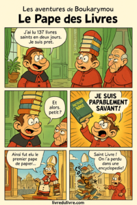 Boukarymou est proclamé pape. Il est assis sur un trône fait entièrement de livres… qui commence à craquer.
