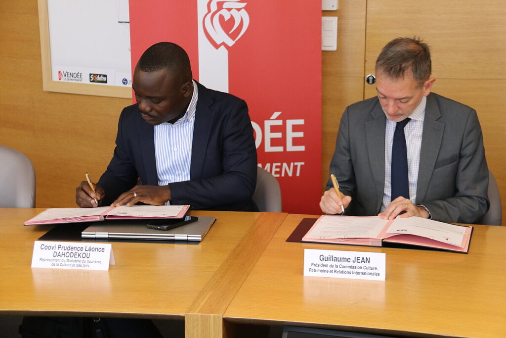 Le Département de la Vendée et la Bibliothèque nationale du Bénin ont signé une convention de coopération de cinq ans entièrement dédiée au développement de la lecture publique au Bénin. Cet accord marque une avancée majeure dans une relation de plus de trente ans entre les deux territoires. Il prévoit un appui technique et organisationnel du réseau vendéen — l’un des plus structurés de France — pour accompagner la structuration et la modernisation du réseau béninois de bibliothèques. La signature de cette convention intervient à la suite d’une mission d’immersion menée en Vendée, du 2 au 4 décembre, par une délégation béninoise composée de Coovi Prudence Léonce Dahodekou, représentant du Ministère du Tourisme, de la Culture et des Arts, et de Koffi Attede, directeur général de la Bibliothèque nationale du Bénin.