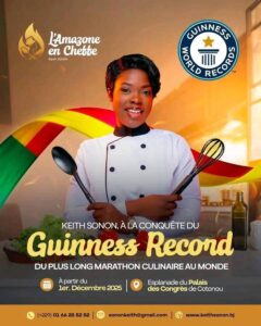 Un nouveau chapitre s’écrit dans l’histoire des records mondiaux — et c’est depuis Cotonou qu’il pourrait se tourner. La cheffe béninoise Keith Sonon se lance, dès le 1ᵉʳ décembre 2025, dans une tentative officielle d’inscription au Guinness World Records Book, avec un marathon culinaire individuel prévu pour durer au moins 15 jours au Palais des Congrès. Une initiative qui place le Bénin au centre de l’attention internationale et qui met en lumière une figure féminine déterminée, techniquement préparée et consciente des exigences documentaires très strictes du Guinness.
