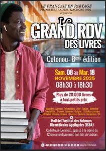 Du samedi 8 au mardi 18 novembre 2025, de 8h30 à 18h30, le Hall de l’Institut des Sciences Biomédicales Appliquées (ISBA) à Cadjèhoun accueillera la 8ᵉ édition du Grand Rendez-vous des Livres, plus connu comme la Foire du livre de Cotonou.
