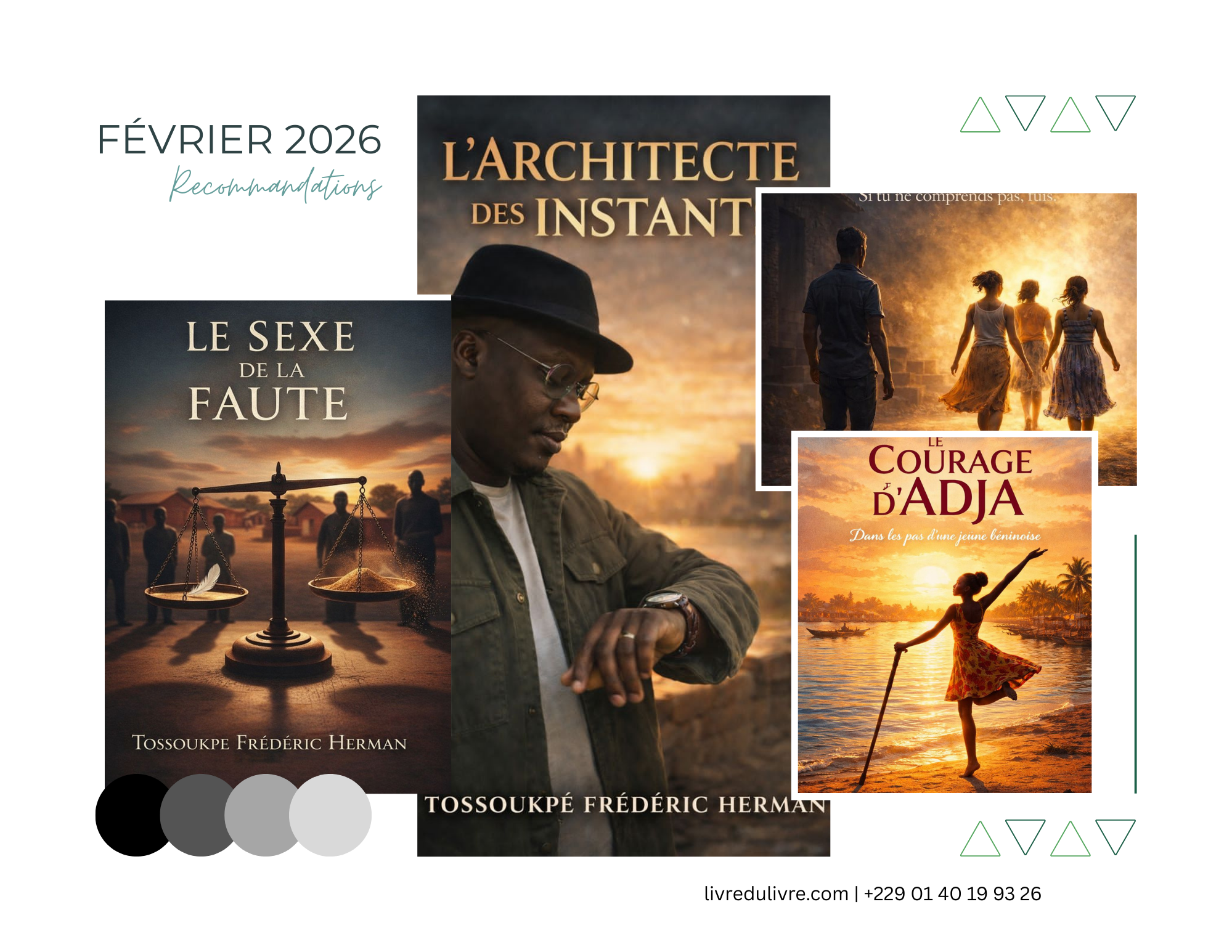 Voici une liste de recommandations de lecture pour février 2026, proposée par la rédaction de L’ivre Du Livre, consacrée aux œuvres de l’écrivain bénino-togolais Frédéric Herman Tossoukpè. Parce que février est le mois de l’amour sous toutes ses formes — amour conjugal, amour de soi, amour maternel, amour de la justice — les ouvrages dont la thématique touche directement à l’amour, aux relations et à l’affect y occupent naturellement la première place.