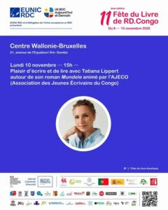 Kinshasa, le 10 novembre 2025. Le Centre Wallonie-Bruxelles va accueillir cet après-midi une rencontre littéraire animée par l’écrivaine Tatiana Lippert, dans le cadre de la 11ᵉ édition de la Fête du Livre de la République Démocratique du Congo, organisée du 8 au 15 novembre 2025.